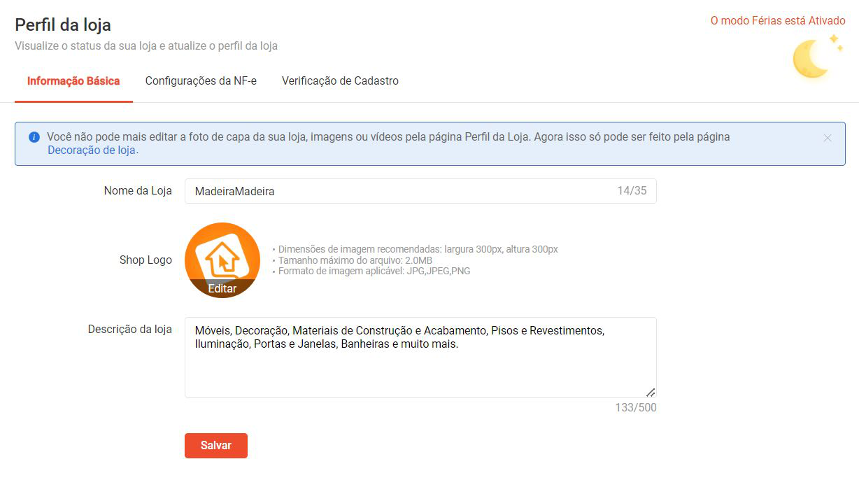 Na Central do Vendedor, no canto esquerdo da tela, acesse os menus Loja > Perfil da Loja. Nessa seção, você vai preencher três informações importantes: