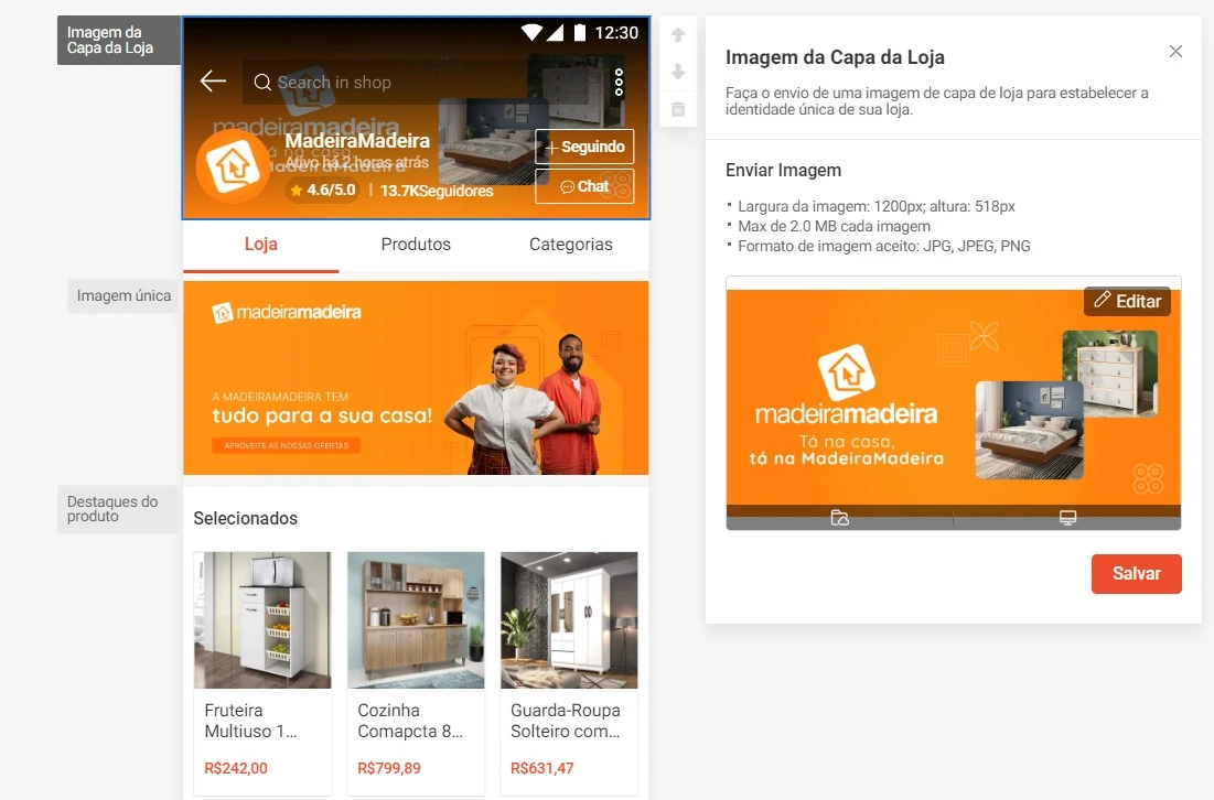Na seção ‘Imagem de capa da loja’, os formatos de imagem disponíveis são: