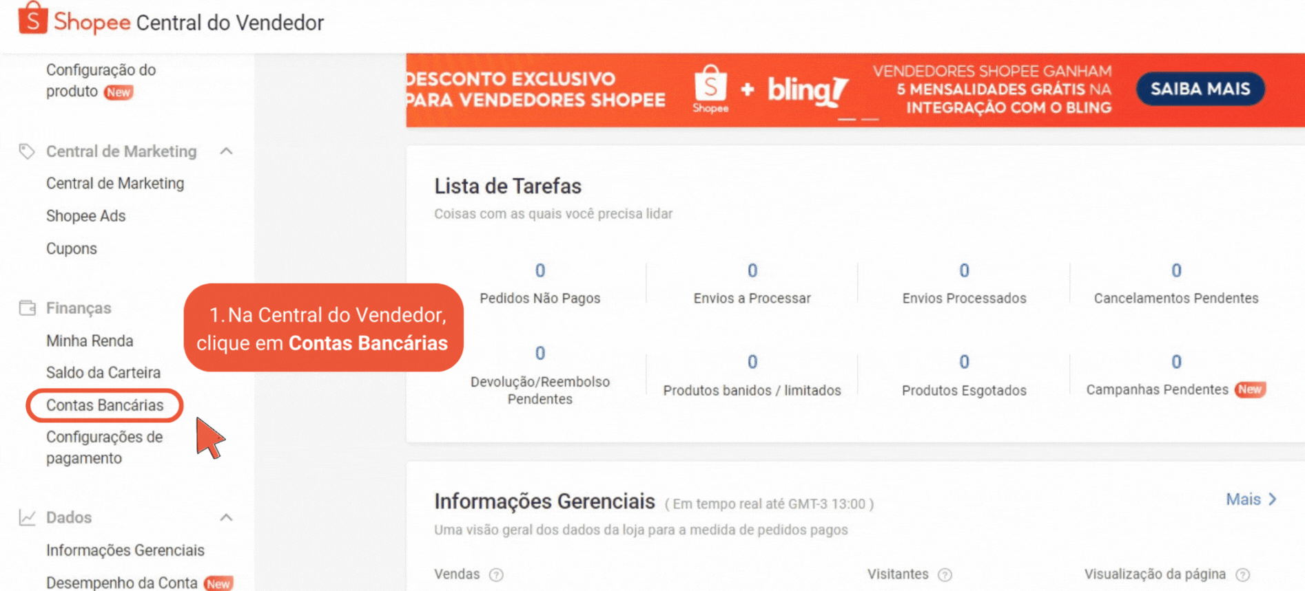 O pagamento dos clientes vai direto para a carteira digital nativa da Shopee. Para movimentar o dinheiro para uma conta bancária, é necessário cadastrar os dados na plataforma.