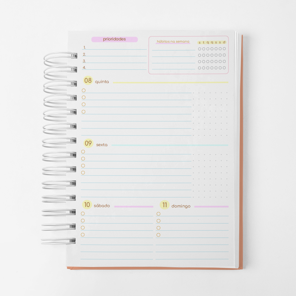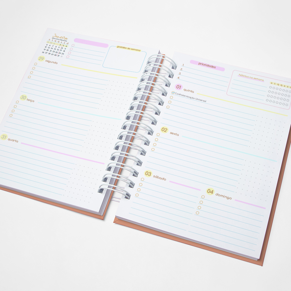 Para que seu Planner fique ainda mais Perfeito, você pode escolher a Capa que preferir para colocarmos nele. Temos uma variedade incrível de opções (acesse no menu Opções de Capas) e escolha a que mais te encantar.